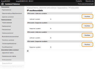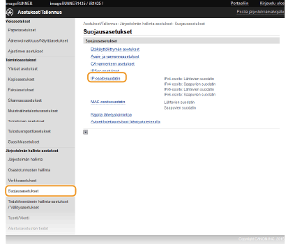 Tarkista, ettei syötössä ole tapahtunut virheitä Jos IP-osoitteet on syötetty väärin, et ehkä pysty käyttämään laitetta Etäkäyttöliittymästä, missä tapauksessa sinun on asetettava <IPv4-osoitesuodatin>- tai <IPv6-osoitesuodatin>-asetukseksi <Ei>. IPv4-osoitesuodatin IPv6-osoitesuodatin