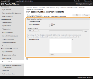 Voit ottaa IP-osoitteen suodatusasetukset käyttöön tai poistaa ne käytöstä