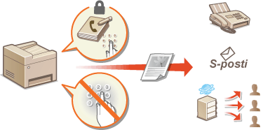 Joissain tapauksissa tietovuotoja voi estää rajoittamalla käytettävissä olevat faksi- ja sähköpostivastaanottajat osoitekirjaan tai LDAP-palvelimelle tallennettuihin osoitteisiin tai asettamalla osoitekirjalle PIN-koodin, jolloin luvattomat käyttäjät eivät voi lisätä tai muokata osoitekirjan tietoja. Voit myös välttää asiakirjojen lähettämisen vääriin osoitteisiin, jos laitteen asetukset määritetään niin, että faksinumero on syötettävä kahdesti sen varmistamiseksi.