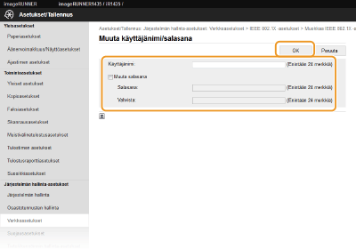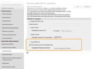 Voit ottaa IEEE 802.1X-todennuksen käyttöön tai poistaa sen käytöstä -painikkeella. IEEE 802.1X -asetukset