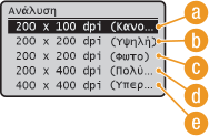 Μπορείτε να επιλέξετε την κατάλληλη ανάλυση για τον τύπο του εγγράφου. Όσο υψηλότερη είναι η ανάλυση τόσο πιο ευκρινής είναι η εικόνα, αλλά και τόσο περισσότερο διαρκεί η αποστολή της.