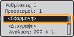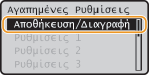 <Αγαπημένες Ρυθμίσεις> <Αποθήκευση/Διαγραφή> επιλέξτε τη ρύθμιση <Διαγραφή> <Ναι> .Οι αποθηκευμένες ρυθμίσεις διατηρούνται ακόμη κι όταν η συσκευή τίθεται εκτός λειτουργίας.