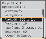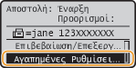 <Αγαπημένες Ρυθμίσεις> <Αποθήκευση/Διαγραφή> επιλέξτε τη ρύθμιση τροποποιήστε τη ρύθμιση <Εφαρμογή> <Ναι> . Δεν μπορείτε να αλλάξετε τους προορισμούς που είναι αποθηκευμένοι στη ρύθμιση με αυτήν τη διαδικασία. Αποθηκεύστε μια νέα ρύθμιση με τους επιθυμητούς προορισμούς.Εάν θέλετε να διαγράψετε μια αποθηκευμένη ρύθμιση, πατήστε