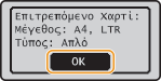 Ελέγξτε ότι έχει τοποθετηθεί στη συσκευή χαρτί με το μέγεθος και τον τύπο που εμφανίζεται στην οθόνη και πατήστε
