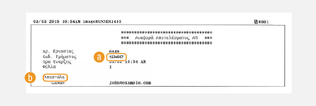 Εμφανίζεται το όνομα και η διεύθυνση ή το όνομα συστήματος του προορισμού. Εάν στείλετε το έγγραφο μέσω e-mail, η αναφορά υποδεικνύει το αποτέλεσμα της μετάδοσης ανάμεσα στη συσκευή και τον διακομιστή e-mail, όχι ανάμεσα στη συσκευή και στη διεύθυνση προορισμού. Ακόμη κι αν αποτύχει η μετάδοση, δεν θα εκτυπωθεί ένας τριψήφιος κωδικός σφάλματος. Για να ελέγξετε τον κωδικό σφάλματος, εκτυπώστε μια Αναφορά Διαχείρισης Επικοινωνίας (