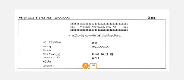 Το "OK" υποδεικνύει ότι το φαξ παραλήφθηκε επιτυχώς, ενώ το "ΑΡ" και τρία ψηφία (ένας κωδικός σφάλματος) υποδεικνύει ότι η επικοινωνία φαξ απέτυχε (
