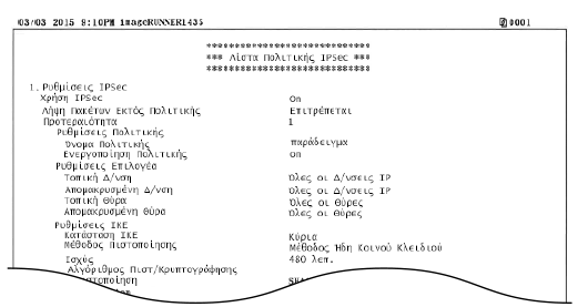 Μπορείτε να εκτυπώσετε μια λίστα για να ελέγξετε τα ονόματα των πολιτικών και των ρυθμίσεων IPSec που είναι αποθηκευμένες την τρέχουσα στιγμή στη συσκευή.
