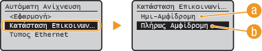 επιλέξτε <Ημι-Αμφίδρομη> ή <Πλήρως Αμφίδρομη> .![]() <Ημι-Αμφίδρομη>Στέλνει και λαμβάνει δεδομένα επικοινωνίας εναλλάξ. Επιλέξτε όταν η συσκευή είναι συνδεδεμένη με συσκευή δικτύου που χρησιμοποιεί ημι-αμφίδρομη επικοινωνία.