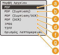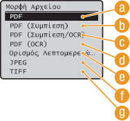 Μπορείτε να επιλέξετε μεταξύ έξι μορφών αρχείων για τη μετατροπή των εγγράφων: <PDF>, <PDF (Συμπίεση)>, <PDF (Συμπίεση/OCR)>, <PDF (OCR)>, <JPEG> και <TIFF>. Τα σαρωμένα έγγραφα μετατρέπονται στη μορφή αρχείου που καθορίζεται εδώ και κατόπιν αποστέλλονται στον καθορισμένο προορισμό.