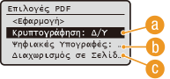 Για τη δημιουργία PDF με κρυπτογράφηση AES 256-bit εμφανίζονται στην οθόνη μόνο οι επιλογές <Acrobat 9.0 ή Ισοδύναμο/256-bit AES> και <Acrobat 10.0 ή Ισοδύναμο/256-bit AES>. Μπορείτε να αλλάζετε τα διαθέσιμα επίπεδα κρυπτογράφησης ανάλογα με τις ανάγκες σας.