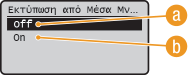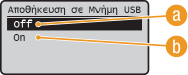 Απενεργοποιεί τη λειτουργία ανάγνωσης δεδομένων από συσκευή μνήμης USB. Δεν είναι δυνατή η εκτύπωση δεδομένων από συσκευή μνήμης USB.