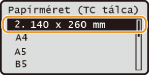 Ha papírt helyez a többcélú tálcába, megjelenik a tálcához tartozó papírméret kiválasztására szolgáló képernyő. A fenti eljárással bejegyzett papírméretek ezen a képernyőn jelennek meg. A papírméret és a papírtípus megadása a többcélú tálcához
