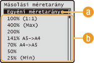 A másolatokat előre beállított méretarányok szerint (pl. <A5->A4>), illetve 1%-os lépésenként beállítható egyéni másolási méretarány megadásával nagyíthatja, illetve kicsinyítheti.