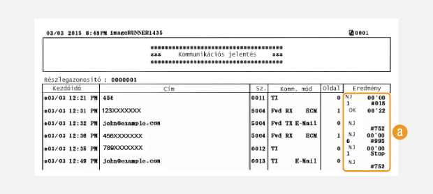 Ha hibakód jelenik meg). Az e-mailben küldött dokumentumokról szóló jelentés a készülék és a levelezőkiszolgáló közötti átvitel eredményét, nem pedig a készülék és a rendeltetési hely közöttiét tükrözi.