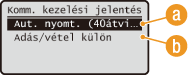 Ha minden 40. átvitel után automatikusan jelentést nyomtatna, válassza a <Be> beállítást. Ha nem, válassza a <Ki> beállítást.
