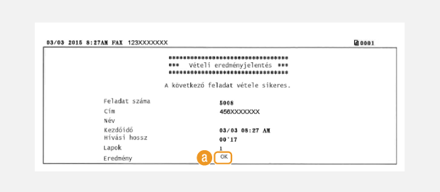 Az „OK” azt jelzi, hogy a fax vétele sikeres volt; míg az „NG” betűk és három számjegy (hibakód) látható, az az fax átvitelének sikertelenségére utal (