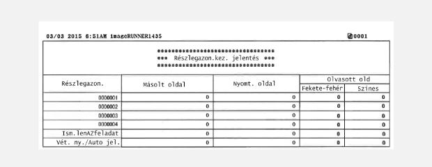 Ha azonosítók kezelése engedélyezve van, részlegazonosítónként ellenőrizheti a másolt, nyomtatott, és beolvasott oldalak számát az erről nyomtatható jelentésben. A jelentéssel megfigyelheti a használat módját, így ennek alapján intézkedhet.