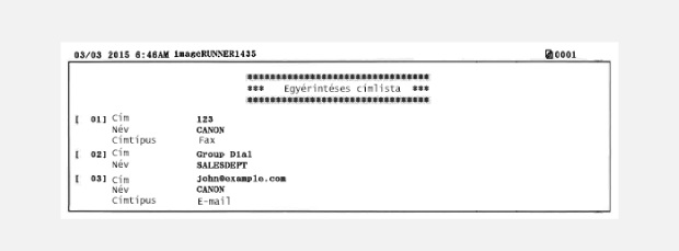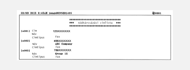 A címjegyzékbe bejegyzett rendeltetési helyek részleteit nyomtatott listában ellenőrizheti. Külön listát lehet nyomtatni a <Kódtárcsás>, <Egyérintéses> és <Csoport> típusú bejegyzésekről.