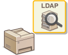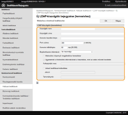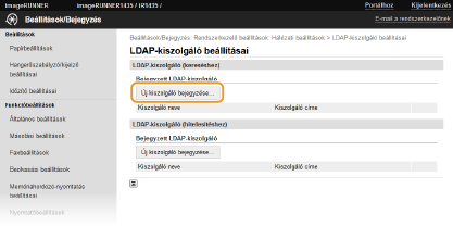 Ha a hálózaton LDAP-kiszolgáló létesítettek, akkor a kiszolgálón is megkeresheti a faxszámokat és e-mail címeket, amelyeket azután megadhat rendeltetési helyként, illetve bejegyezhet a címjegyzékbe. A készülékre öt LDAP-kiszolgáló jegyezhető be. Az LDAP-kiszolgálókat a Távoli felhasználói felületen keresztül jegyezze be.