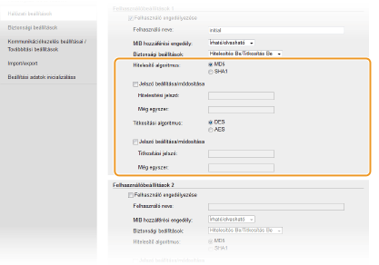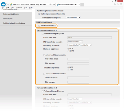 Jelölje be az [Felhasználó engedélyezése] jelölőnégyzetet, és adja meg a [Felhasználó neve], [MIB hozzáférési engedély] és [Biztonsági beállítások] beállításokat.