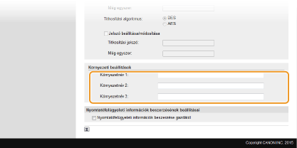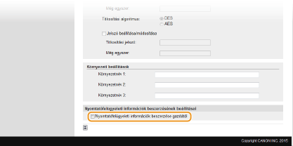 Ezeket a beállításokat csak akkor határozza meg, ha az [Hitelesítés Be/Titkosítás Be] vagy az [Hitelesítés Be/Titkosítás Ki] lehetőséget választotta a [Biztonsági beállítások] mezőben.