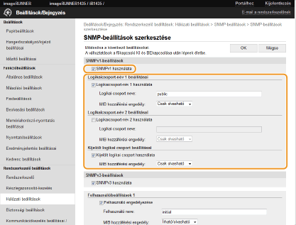 Jelölje be a [Kijelölt logikai csoport használata] jelölőnégyzetet, és adja meg a [MIB hozzáférési engedély] beállítást.