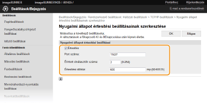 A jelölőnégyzet bejelölésével értesítheti az eszközfelügyeleti szoftvert a készülék üzemállapotáról. Ha az [Értesítés] jelölőnégyzet be van jelölve, akkor a készülék nyugalmi üzemmódban nem okoz felesleges kommunikációt, és csökkenti a teljes energiafogyasztást. [Port száma:]