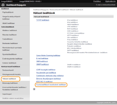 Egy eszközfelügyeleti szoftvernek, például az iW Management Console* programnak a hálózaton történő bevezetésével megkönnyítheti a hálózatba kötött eszközök különböző adatainak összegyűjtését és kezelését. Az eszközbeállítások, címjegyzékek, hibanaplók és hasonló információk a kiszolgáló számítógépen keresztül lekérdezhetők és terjeszthetők. Ha a készüléket ilyen hálózathoz csatlakoztatja, akkor az eszközkezelő szoftver az SLP (szolgáltatás-keresési) protokollal megkeresi a készüléket a hálózaton, és begyűjti a rá vonatkozó adatokat. Ez a rész leírja az SLP beállításait, illetve a készülék és a beépülő modulok közötti kommunikáció beállításait az iW Management Console számára. Ezek a beállítások a Távoli felhasználói felületen keresztül adhatók meg.