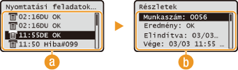 gombot.![]() <Nyomt. feladatnapló>A nyomtatott dokumentumok listáját jeleníti meg. Ha a dokumentum nyomtatása sikeres volt, akkor az <OK> felirat jelenik meg, ha viszont megszakítás vagy valamilyen hiba miatt sikertelen volt, akkor a <Hiba> jelzés látható.