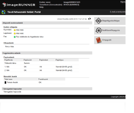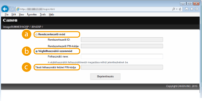 A használhatja a Távoli felhasználói felületet és minden beállítást alkalmazhat. Adja meg a megfelelő azonosítót a [Rendszerkezelő ID:], és a PIN-kódot a [Rendszerkezelő PIN-kódja:] (