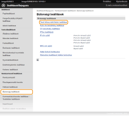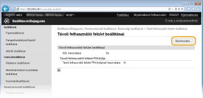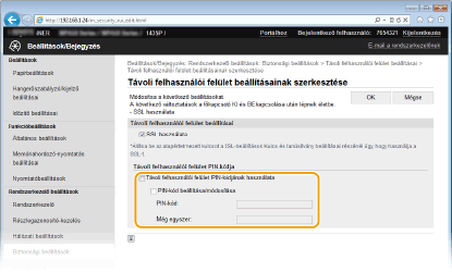 <Rendszerkezelő beállítások> <Távoli felhasználói felület beállításai> <Táv. felh. felü. elérésének bizt. beáll.> <Be elemet > Adja meg a PIN-kódot <Alkalmaz> Adja meg a PIN-kódot (megerősítés) <Alkalmaz> .Ha inicializálódnak a Távoli felhasználói felület beállításaiA Távoli felhasználói felület PIN-kódja szintén inicializálódik. Az inicializálást követően állítsa be újra a PIN-kódot. A menü alaphelyzetbe állítása