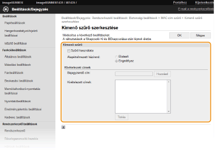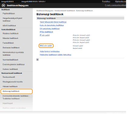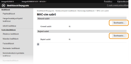 Beviteli hibák ellenőrzése Ha helytelenül adja meg az MAC címeket, akkor előfordulhat, hogy nem fog tudni hozzáférni a készülékhez a Távoli felhasználói felületről, amely esetben a <MAC-cím szűrő> beállítását <Ki> értékre kell állítani. MAC-cím szűrő