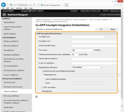 Válassza a [Használatban] vagy [Használatban (Biztonsági hitelesítés)] lehetőséget attól függően, hogy milyen típusú hitelesítést alkalmaz az LDAP-kiszolgáló.
