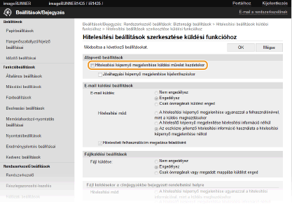 Jelölje be a [Hitelesítési képernyő megjelenítése küldési művelet kezdetekor] jelölőnégyzetet az Authorized Send funkció engedélyezéséhez.