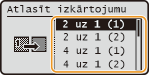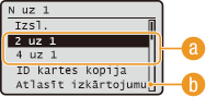 , varat palielināt vai samazināt kopēšanas koeficientu, bet palielinot var netikt nokopētas dokumenta malas.Iespēja <2 uz 1>/<4 uz 1> nav pieejama, izmantojot <Dzēst kontūru> vai <ID kartes kopija>.