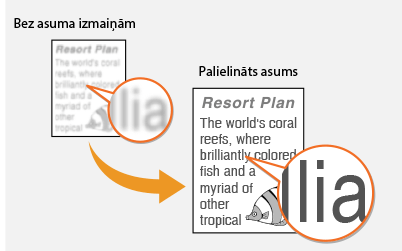 Pirms sūtīšanas ir iespējams koriģēt attēla asumu. Palieliniet asumu, lai padarītu skaidrākus izplūdušus tekstus un līnijas, vai samaziniet asumu, lai uzlabotu žurnālu fotoattēlu izskatu.