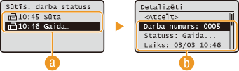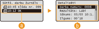 <Detalizēti>Parāda detalizētu informāciju par sarakstā izvēlēto dokumentu. Ja esat norādījis vairākus adresātus, ekrānā tiek parādīts norādīto adresātu skaits. Lai skatītu detalizētu informāciju par vairākiem norādītajiem adresātiem, izvēlieties <Adresātu skaits> un nospiediet