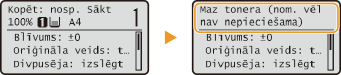 <Zems>: tonera uzpildes līmenis ir zems. Sagatavojiet rezerves tonera kasetni.