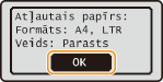 Pārbaudiet, vai iekārtā ir ievietots ekrānā parādītais papīra formāts un veids, un nospiediet
