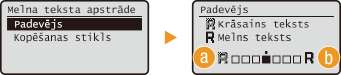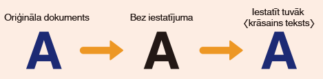 Skenējot krāsainus dokumentus, varat panākt, ka melnās un melnai tuvās krāsas teksts vairāk atbilst oriģināla dokumentam, vai pielāgot melnā teksta redzamību, lai padarītu to vieglāk lasāmu. Padevei un kopēšanas stiklam var norādīt atšķirīgus iestatījumus.