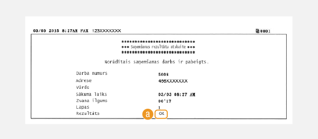 Uzraksts “OK” norāda, ka fakss tika saņemts sekmīgi, savukārt uzraksts “NĒ” un trīs cipari (kļūdas kods) norāda, ka faksa sūtīšana neizdevās (