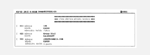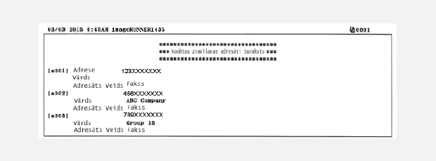 Varat izdrukāt sarakstu, lai pārbaudītu detalizētu informāciju par adrešu grāmatā reģistrētiem adresātiem. Sarakstus var izdrukāt atsevišķi pa reģistrācijas veidiem: <Kodētā numura sastādīšana>, <Viena skāriena> un <Grupa>.