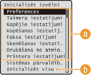 Norādījumus, kā atjaunot iestatījumus kategorijās <Tīkla iestatījumi> un <Sistēmas pārvaldības iestatījumi>, skatiet sadaļā Sistēmas pārvaldības iestatījumu inicializēšana.