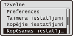Visi kopēšanas iestatījumi ir ar īsu aprakstu. Noklusējuma iestatījumi ir atzīmēti ar krustiņu (