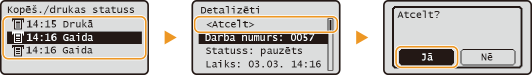 Atcelšana, izmantojot utilītprogrammu Remote UI (Attālais lietotāja interfeiss)Drukāšanu var atcelt utilītprogrammas Remote UI (Attālais lietotāja interfeiss) lapā [Job Status]: Izdrukāto dokumentu pašreizējā statusa pārbaude