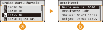 .![]() <Drukas darbu žurnāls>Tiek parādīts izdrukāto dokumentu saraksts. <Labi> tiek rādīta, ja dokuments ir sekmīgi izdrukāts, un statuss <Kļūda> tiek parādīta, ja dokumenta drukāšana neizdevās, jo tas tika atcelts vai radās kļūda.