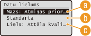 Varat norādīt faila saspiešanas koeficientu, kas tiek lietots, kad dokumenti tiek skenēti jūsu norādītajā faila formātā (Faila formāta izvēle). <Mazi: atmiņas prioritāte> padara saspiešanas koeficientu augstāku nekā parasti, lai izveidotu mazākus failus ar zemāku attēla kvalitāti. Savukārt <Lieli: attēlu kvalitātes prioritāte> padara saspiešanas koeficientu zemāku nekā parasti, lai izveidotu lielākus failus ar augstāku attēla kvalitāti.
