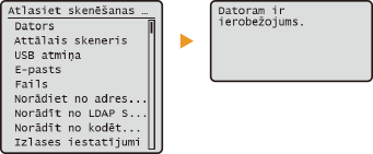 Ja ir atzīmēta izvēles rūtiņa [Scan], dokumentu skenēšana USB atmiņas ierīcēs, e-pasta ziņojumos un failu serveros ir atspējota. Var arī atspējot dokumentu skenēšanu datorā, izmantojot iestatījumus <Dators> un <Attālais skeneris>. Taču dokumentu skenēšanu datorā varat atspējot tikai visiem nodaļu ID. (Darbu bloķēšana, ja nav zināms nodaļas ID).