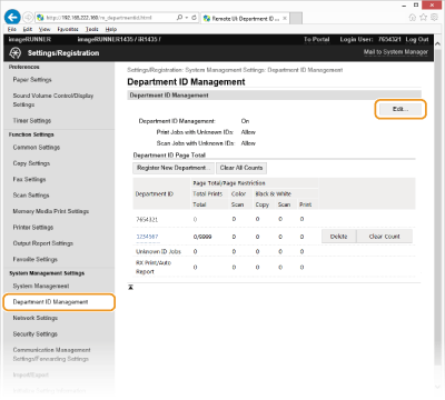 Atzīmējiet izvēles rūtiņu [Use Department ID Management] (Lietot nodaļas ID pārvaldību) un noklikšķiniet uz [Settings] (Iestatījumi), kas atrodas pa labi.
