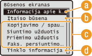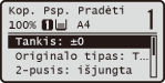 Ekrane rodomi kopijavimo, nuskaitymo ir kitų funkcijų bei jų parametrų nustatymo ekranai. Be to, ekrane galite peržiūrėti klaidų pranešimų ir veikimo būsenos informaciją.